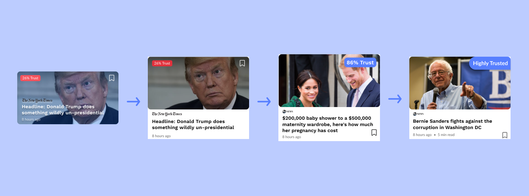 The headings and news site logos did not stand out enough against the background photos, and with longer headlines, would obscure too much of the photo. To fix this, we moved the text-based elements below the photo.